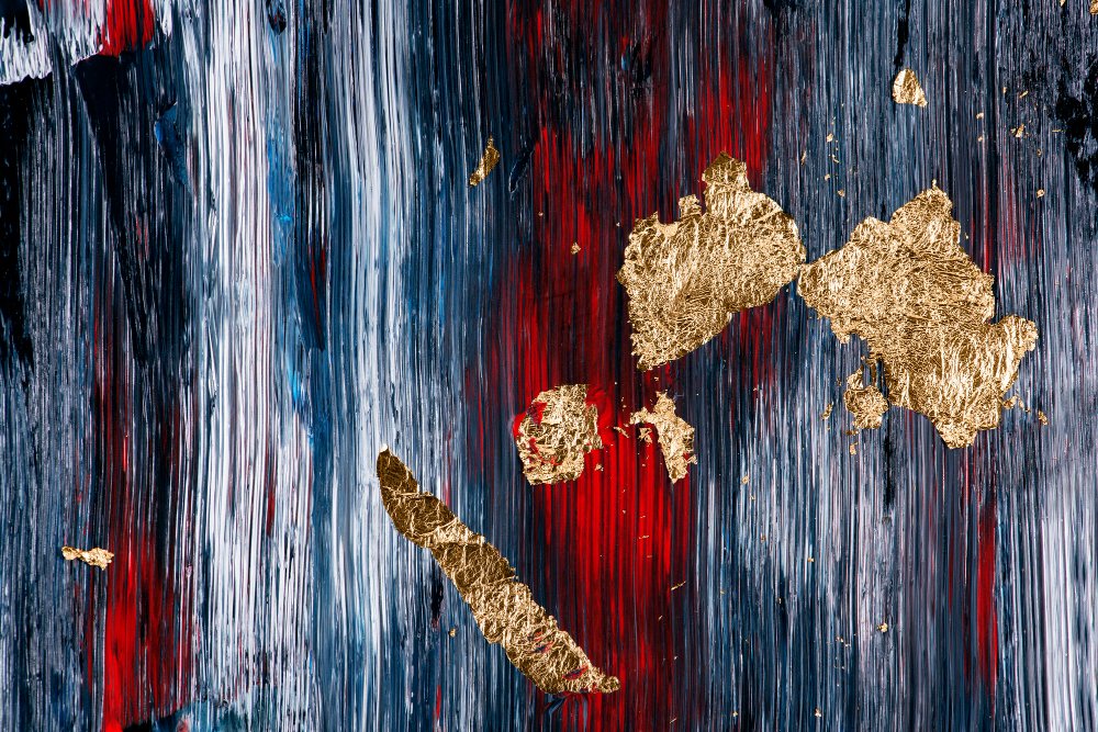 Layers of deep blues and striking reds cascade vertically, interrupted by textured gold leaf accents. The piece captures the beauty within disorder — where raw emotion meets luxury and strength emerges from abstraction.